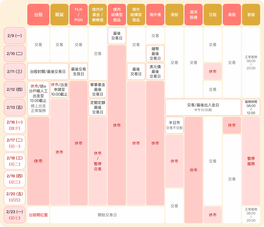 - 境內外基金:單筆基金最後交易日:2/12 (四)、定期定額最後交易日:2/13 (五)。